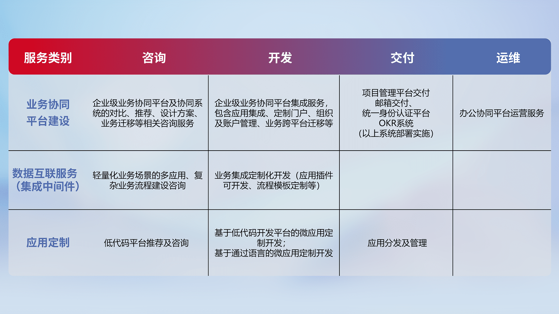 针对钉钉、、、、企微、、、、IDaas等平台级产品提供产品的规划、、方案、、、交付、、、、定制化开发等服务,,,,实现如统一协同办公、、智能客户服务、、、、混合会议管理、、智能数据查询、、、等业务场景,,,实现数字化转型。。